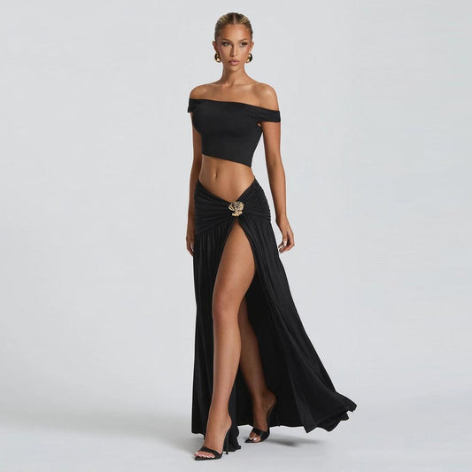 SVCM000047 Women's sexy off-the-shoulder crop top T-shirt, vest, slimming side slit skirt set
