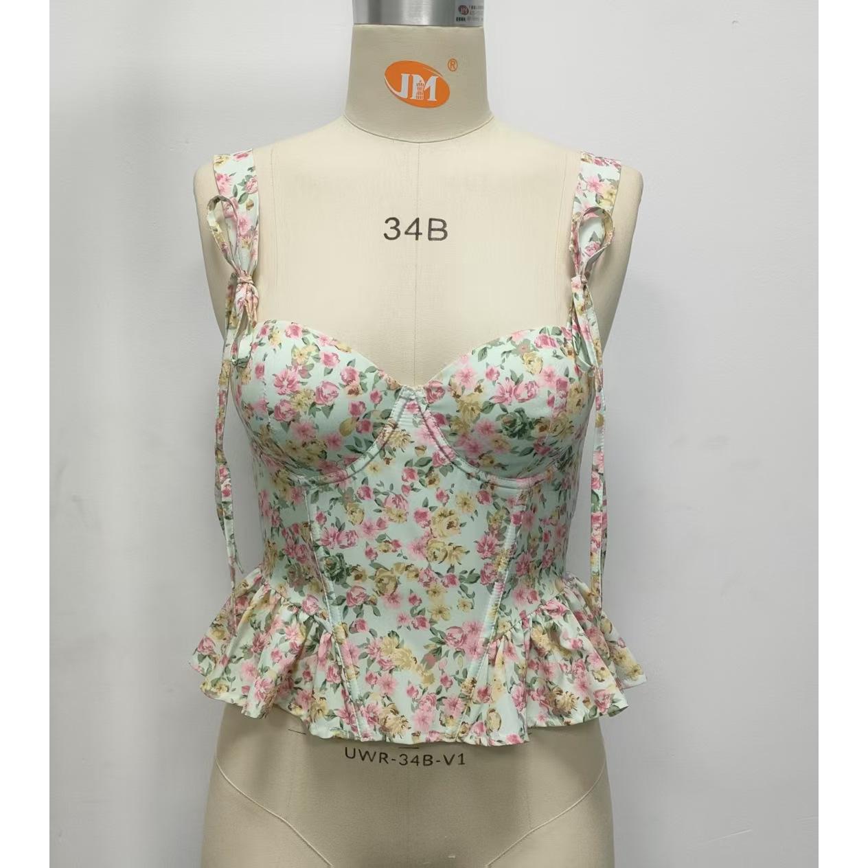 SVCST000017 Adjustable floral lace-up, fishbone corset, cinched waist, ruffled strappy vest