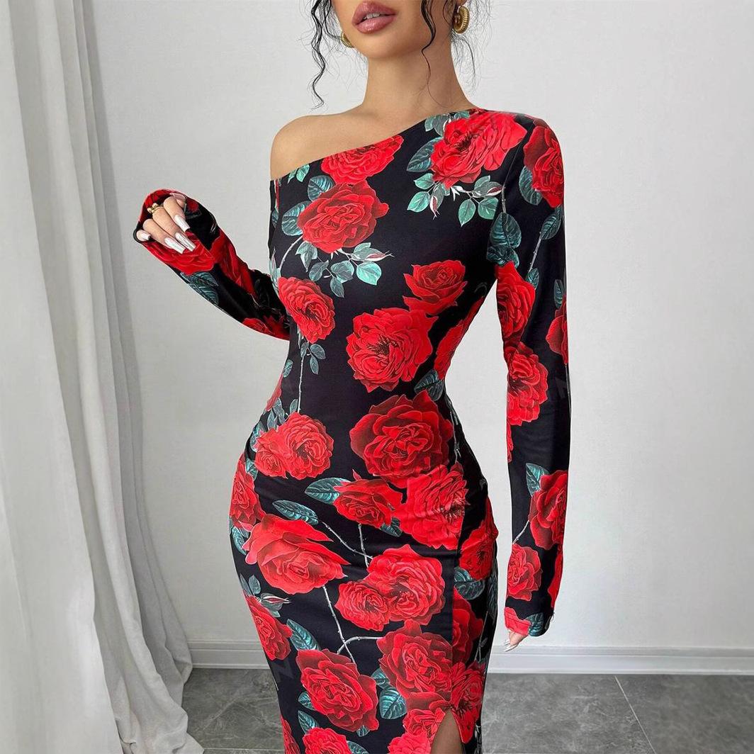 SVCD000035 Elegant rose slit figure-hugging dress, fashionable and sexy printed slimming long dress